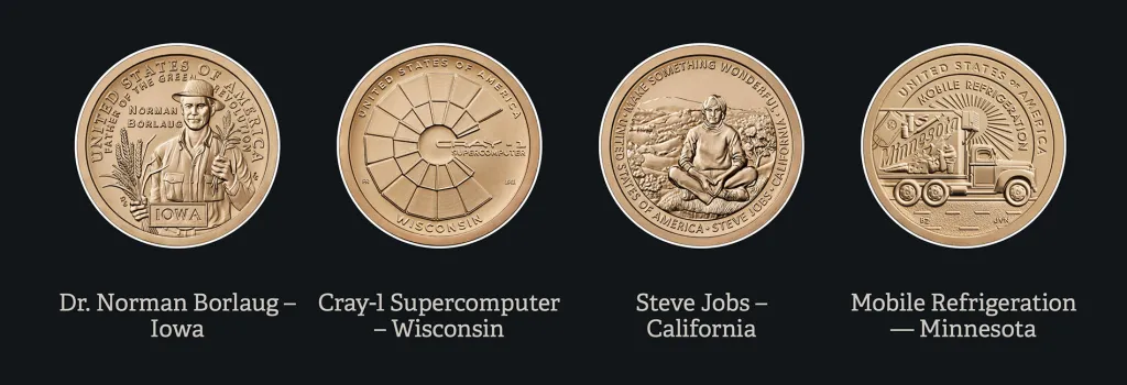 同期发布的其余三枚硬币分别纪念:爱荷华州的诺曼·博洛格博士、威斯康星州的Cray-1超级计算机,以及明尼苏达州在移动制冷技术领域的突破性贡献。