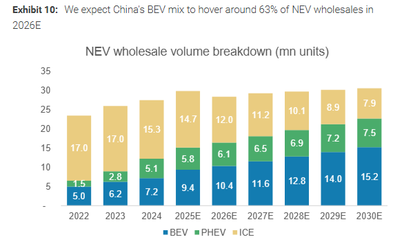 (预计2026年中国纯电动汽车在新能源汽车总销量中的占比将维持在63%左右)不过报告维持2026年预测不变,预计汽车销量将同比下降5%。主要原因有二: