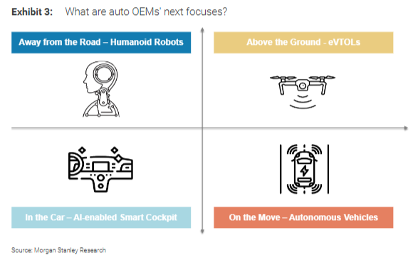 AI具身智能机器人(AI Embodiment):汽车供应链在发展人形机器人方面具备天然优势。自动驾驶车辆与人形机器人在算力、算法和物料清单(BoM)成本上存在巨大重叠。部分中国车企的目标是从2026年开始商业化和量产人形机器人,这可能成为继电动汽车和飞行汽车(eVTOL)之后,车企的下一个“必选项”。