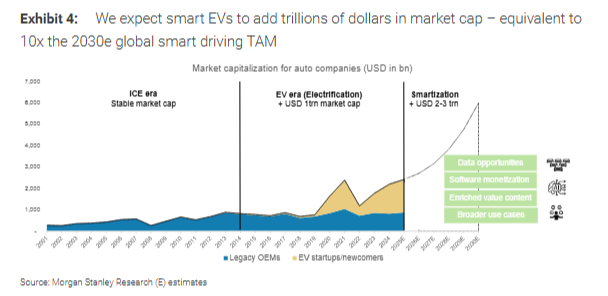 (汽车OEM厂商接下来的发展方向)AI驱动万亿市值增量,估值体系面临重塑报告预计,到2030年智能电动车将为汽车公司增加2-3万亿美元市值,相当于2030年全球智能驾驶总体市场(TAM)的10倍。