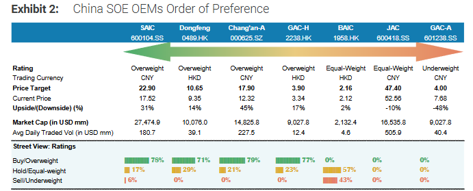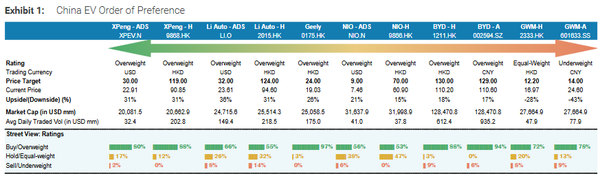 (摩根士丹利关于电动汽车评级排序,左高右低)