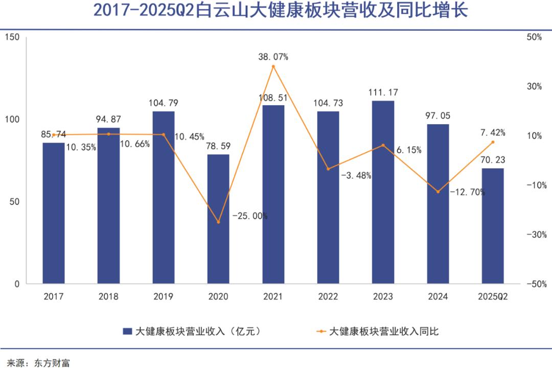 根据王老吉母公司白云山的历年财报,以王老吉为主体的大健康板块自从2019年之后,也陷入了营收动荡。除去特殊年份的不利影响,去年大健康板块营收97.05亿元,在正常财年内也出现了首次下滑。
