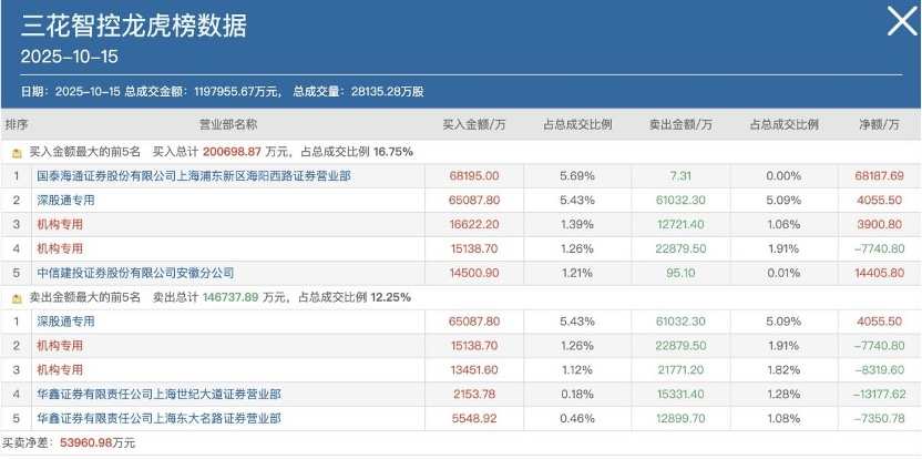 因“小作文”涨停后,三花智控10月15日成交额119.8亿元,换手率7.64%。盘后龙虎榜数据显示,买入前五席位合计总额达20亿元,其中,游资章盟主席位买入超6.8亿元。
