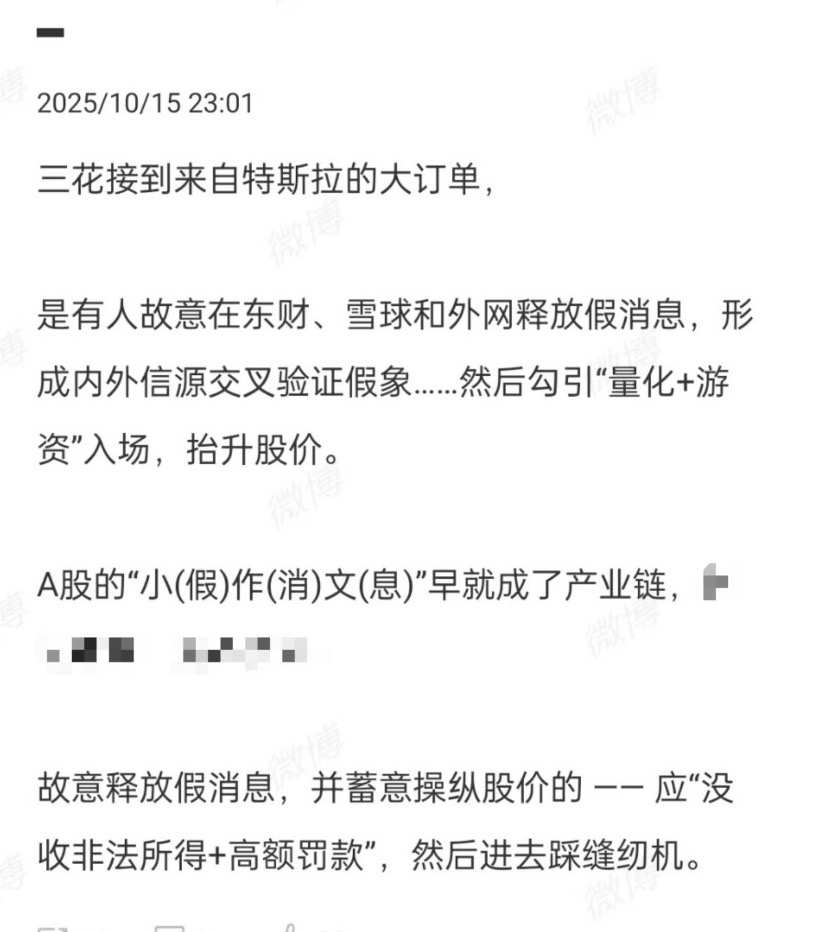 ①特斯拉50亿订单传闻拉涨停,三花智控紧急辟谣,顶级游资章盟主买入6.8亿,是误信谣言还是另有布局?②旧闻翻炒搅动市场,“小作文”背后疑现灰色产业链。监管持续打击虚假信息,但乱象仍难根除。