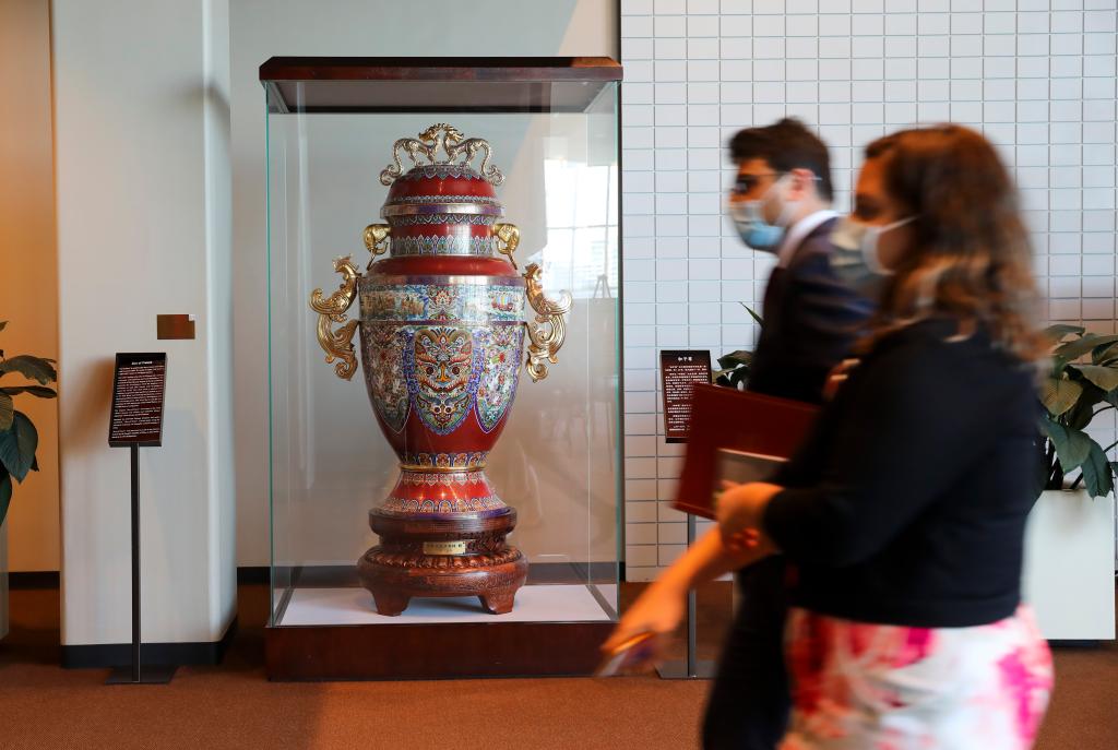 这是2021年10月21日在纽约联合国总部拍摄的中国政府赠送的“和平尊”。