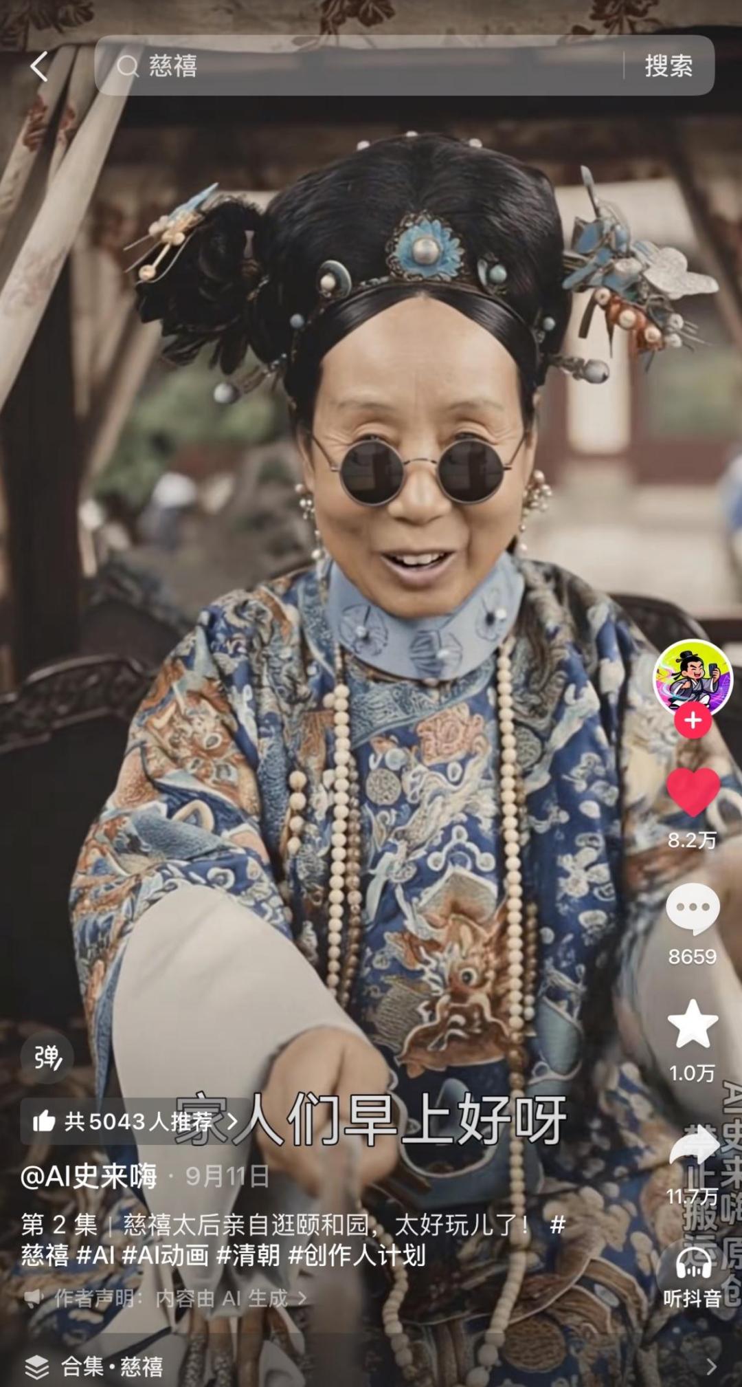 宠物之外,第一人称历史内容也是目前较为常见的AI短视频。@AI史来嗨 代入历史人物的第一视角去讲述知识,如「慈禧的一天」「朱元璋要饭的一天」「张骞逃命直播」等等;创作者@陪宝贝磨耳朵 主打「用AI把古文故事生成画面」,让古文变得生动有趣;创作者@AI小宝 重返历史名场面,直击现场;@大圆镜科普 用AI把科普内容变得可视化。