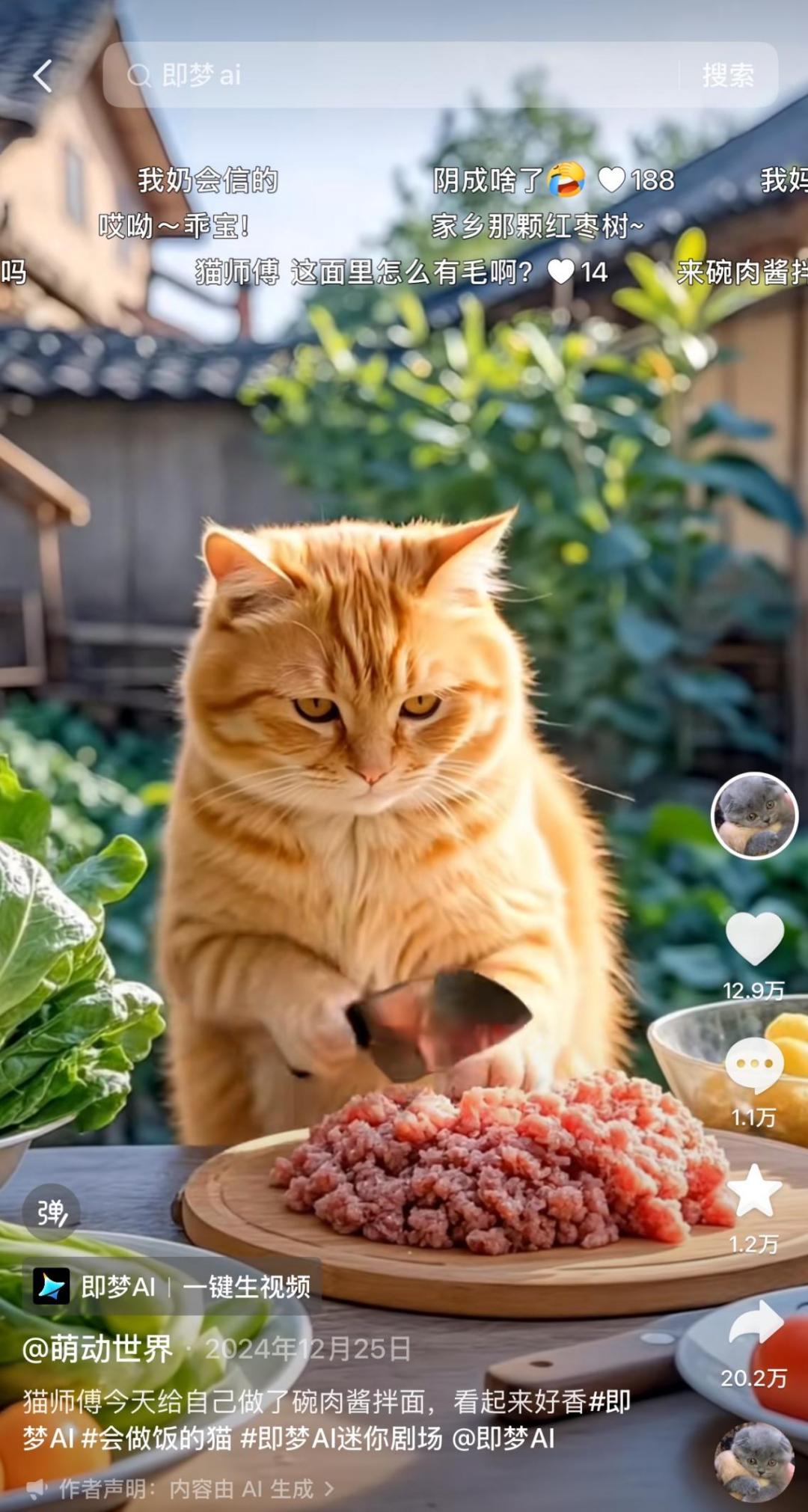 面对来势汹汹的AI内容,抖音用户展现出高度的开放和参与感。小猫小狗AI视频的评论区,无人追问「这是真的吗?」,而是默契地进入剧情设定:如果视频中的白猫扮演反派,评论区便会整齐划一地玩梗:白猫的抖音号发过来,我要去网暴它!」