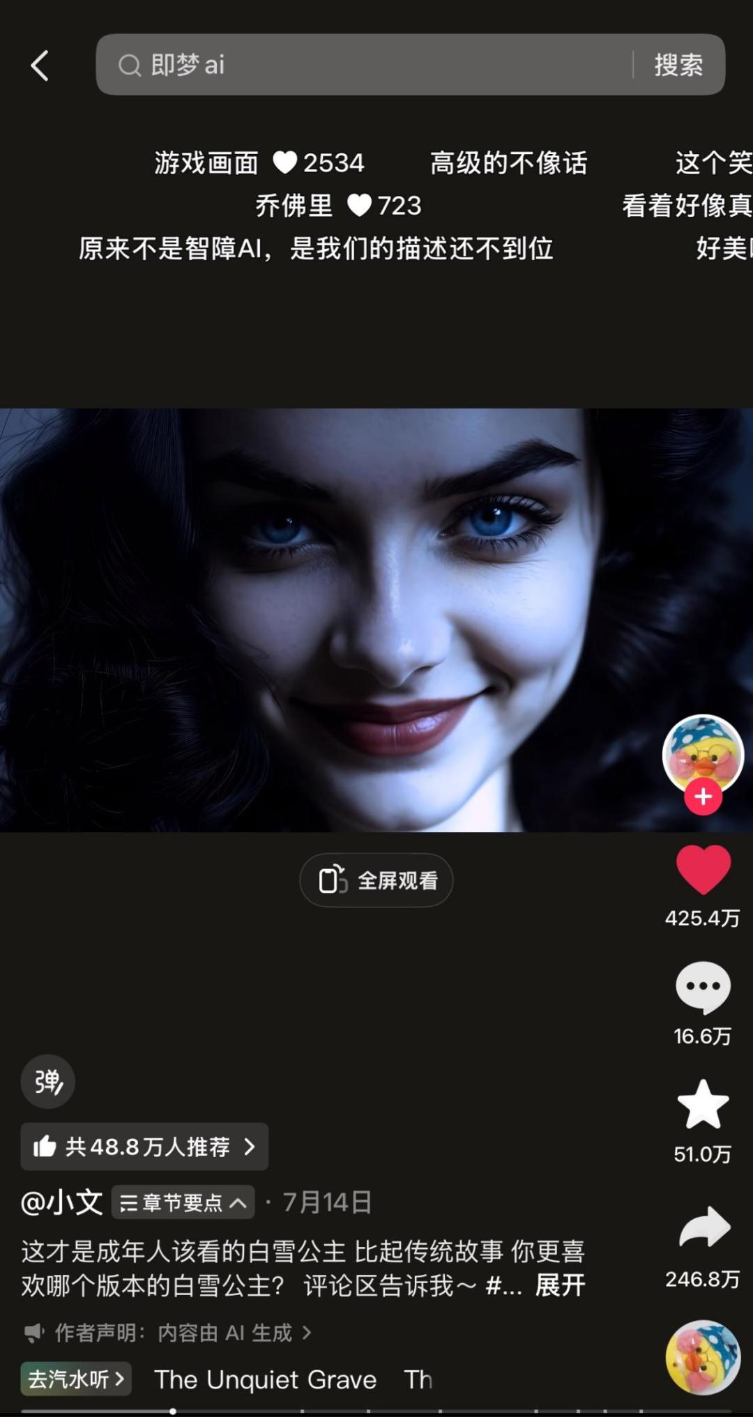 博主@陶阿狗君 此前便以赛博朋克美学和创意剪辑知名,借助AI,其换装视频单条在抖音点赞破216万。@映峰大叔 的「东方奇谭」系列动画,以独特的色彩和美学风格让网友惊叹「到底和AI说了什么」。@小文 用即梦AI重新创作的「权力的游戏版白雪公主」故事新颖、叙事紧凑,在抖音获得425万点赞。
