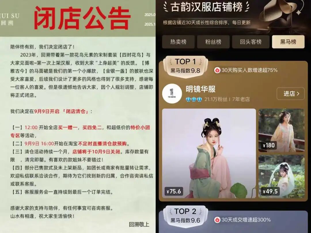 不仅仅是“子衣明堂”,日前,一家7年老店“明镜华服”同样公告,将于2025年11月7日闭店,该店在淘宝仍有超21万粉丝,是古韵汉服店铺榜TOP1,店铺年销量超30万件。