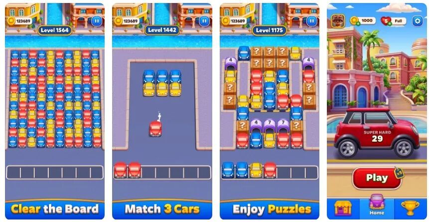 到了今年,停车场题材的休闲游戏终于有一个跑出千万月流水的产品“Car Match-Traffic Puzzle”,这款游戏的主要变化在于将挪车题材融入到消除品类。点点数据目前显示最近30天流水达到185万美元,日流水保持在5~7万美元。Sensor Tower则显示最近30天流水已达到202万美元,其中有200万美元都来自iOS端。