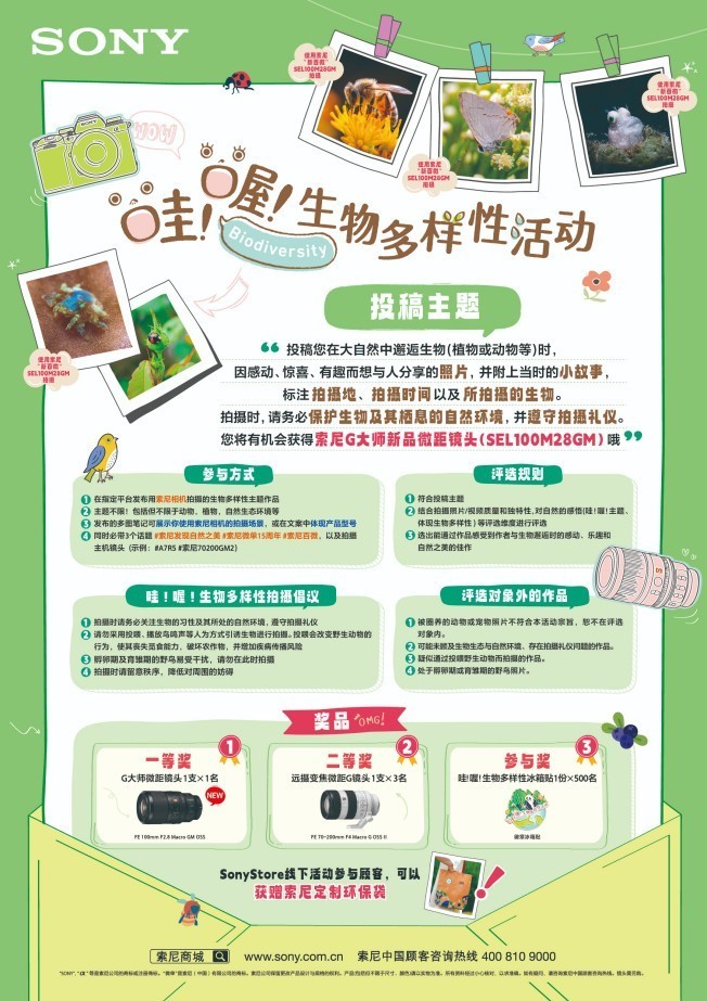 ✨ **“哇!喔!生物多样性”十周年庆典与摄影比赛启动**:为纪念活动十周年,索尼将“哇!喔!生物多样性”活动升级为一场面向公众的摄影比赛,旨在通过影像的力量,让更多人发现并守护地球的生物多样性。活动邀请广大摄影爱好者使用索尼相机,在小红书、微博、Bilibili等平台分享以生物多样性为主题的精彩瞬间,记录自然之美。