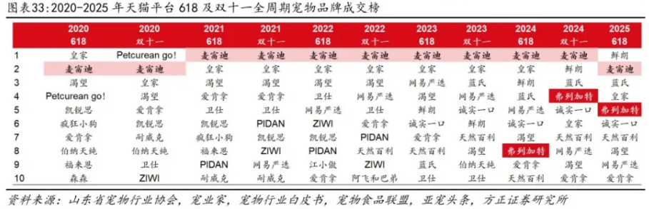 更值得注意的是,方正证券研报中显示,在高爷家起家的核心线上渠道——天猫平台中,近三年来无论是618大促还是双十一购物节的全周期宠物品牌成交榜单中,高爷家均未进入前列,这一细节更直观凸显了国内宠物食品市场 “群雄逐鹿” 的激烈态势。
