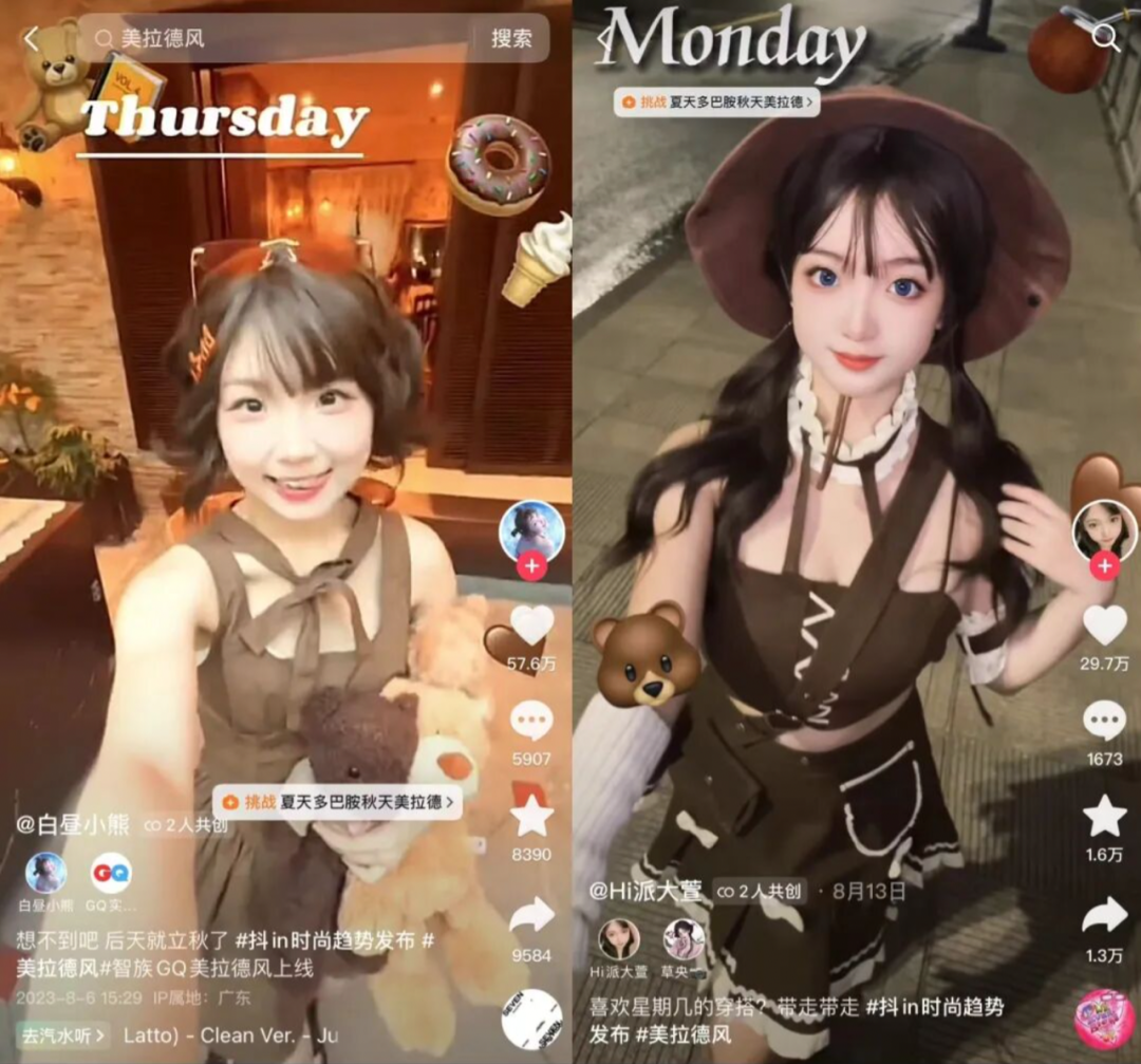 “抖音趋势榜”的前身,是2023年启动的营销IP“抖in时尚趋势发布“。一个标志性事件是,穿搭博主@白昼小熊 发布的“多巴胺穿搭”视频,被认为是该趋势在全网传播的起点,这背后正是由“抖in时尚趋势发布”所发起和推动。同年,“抖in时尚趋势发布“又联合《智族GQ》共同发布了“美拉德风”,同样成为了风靡全网的时尚风潮。从“多巴胺”、“美拉德”到后续的“五金女孩”“薄荷曼波”等,显示出其持续造风的能力。