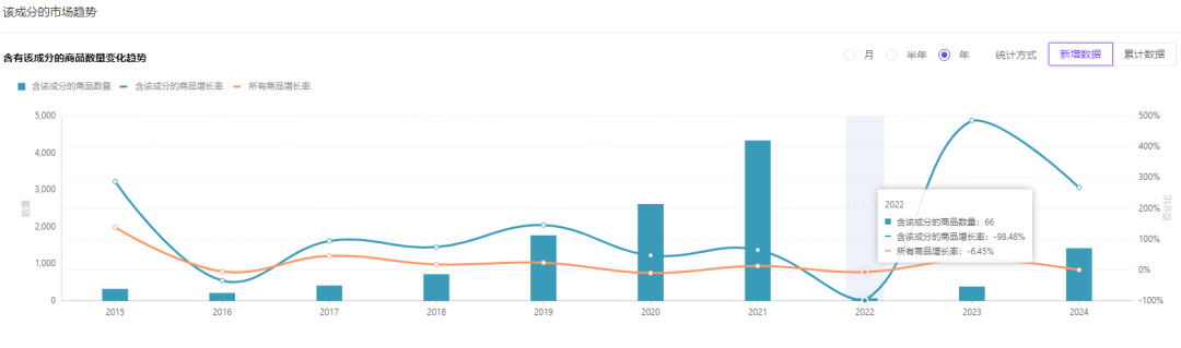 新政影响立竿见影,2022年市场新增377产品备案数量从2021年的4342件断崖式下跌至66件。这一监管窗口期,为早已在此布局的肌肤未来创造了一片蓝海。