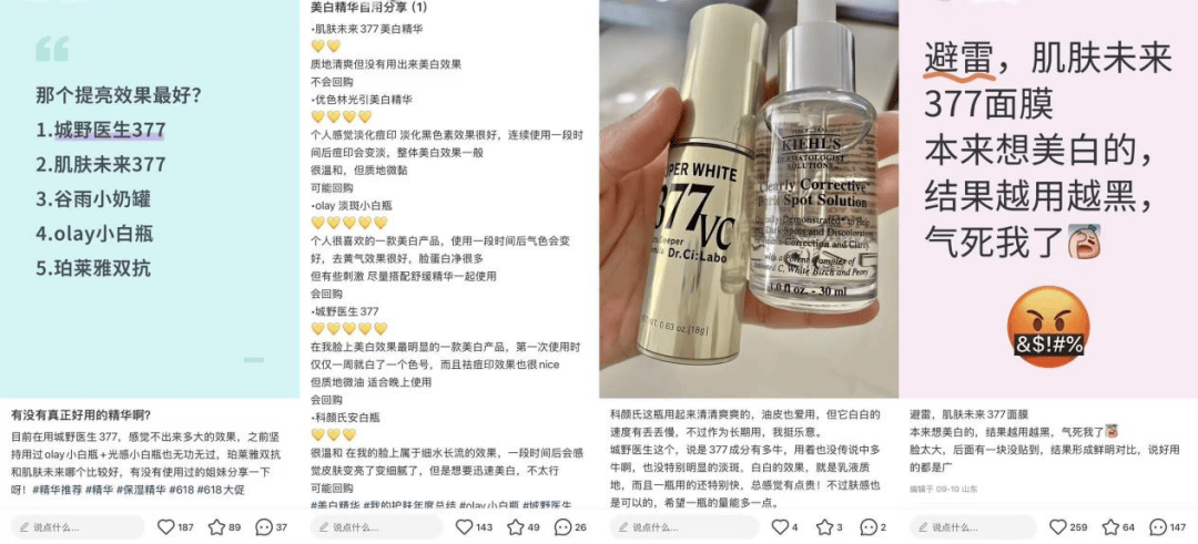 「创业最前线」浏览了消费者发布在社交平台上关于美白精华的测评贴,发现消费者在购物决策前,常常将肌肤未来377产品与城野医生、谷雨、OLAY等品牌竞品对比。而有使用过不同款美白精华的消费者,在平台分享对比测评时提到,肌肤未来377产品在肤感上表现优秀,但美白效果相对平淡。