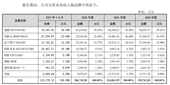 旗下主力品牌滋源、法兰琳卡、美肤宝,均未能抓住线上流量红利、在国货美妆的黄金发展期建立起强大的品牌认知,收入出现不同程度下滑。而新品牌即肽、澳魅、康博雅等,收入规模始终难以突破0.5亿元,无法挑起大梁。