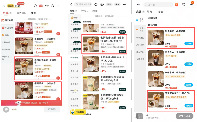 但是,令人疑惑的是打开京东、美团和淘宝的外卖平台却发现七鲜咖啡在每个平台是存在很大的价格差异的,例如京东秒送上门店显示一杯椰青美式折扣后价为6.9元、茉莉花香拿铁7.9元,而美团外卖一杯椰青美式为17.8元、茉莉花香拿铁16.8元,淘宝闪购则分别为原价19.8元折后15.8元、原价18.8元折后14.8元。