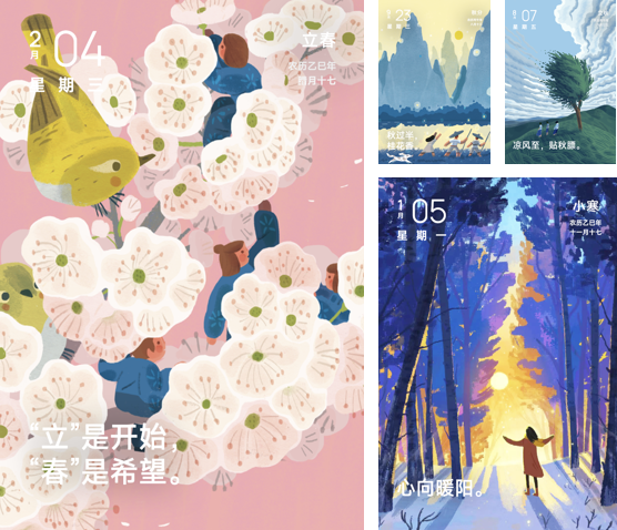 特别值得一提的是,二十四节气的配套插画独具匠心,将中式美学的雅致意趣表达得淋漓尽致。一年过去,把它们拿出来拼在一起,就是一组可以反复观赏的二十四节气美图。
