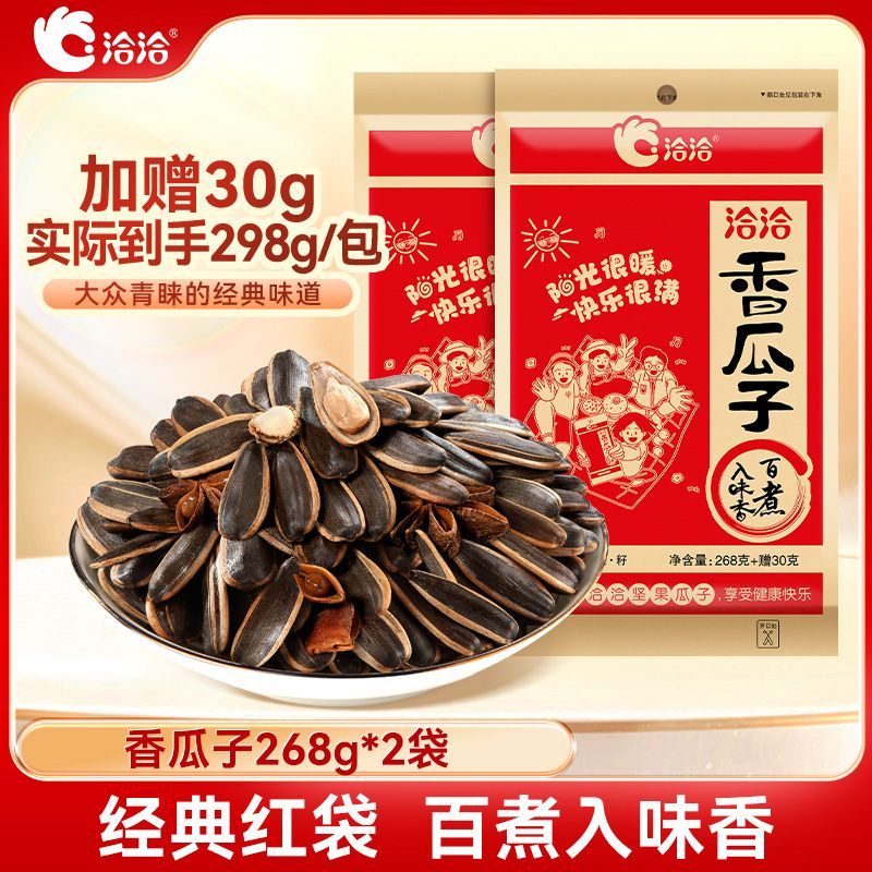 洽洽经典红袋五香葵瓜子来啦!这款268g2袋的香瓜子,是炒货界的经典之选。瓜子颗颗饱满,五香口味浓郁,嗑起来香脆可口,让人停不下来。
