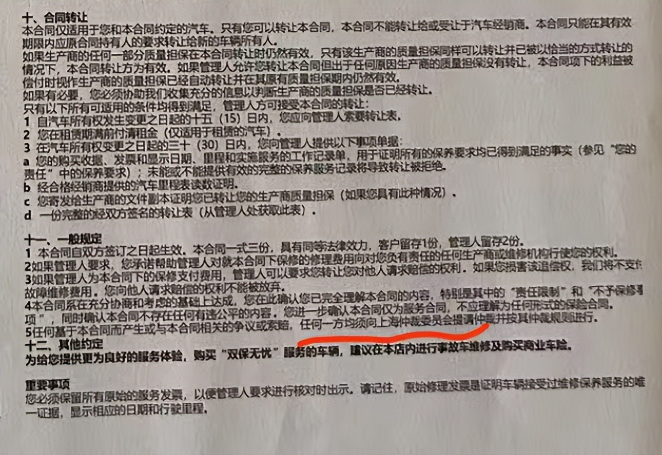 “双保无忧”合同的结尾,有一行容易被忽视的条款:“任何基于合同产生的争议或索赔,需向上海仲裁委员会提请仲裁并按照仲裁规则执行。”这意味着北京的车主需要跑到上海,用远高于诉讼的价格进行仲裁。