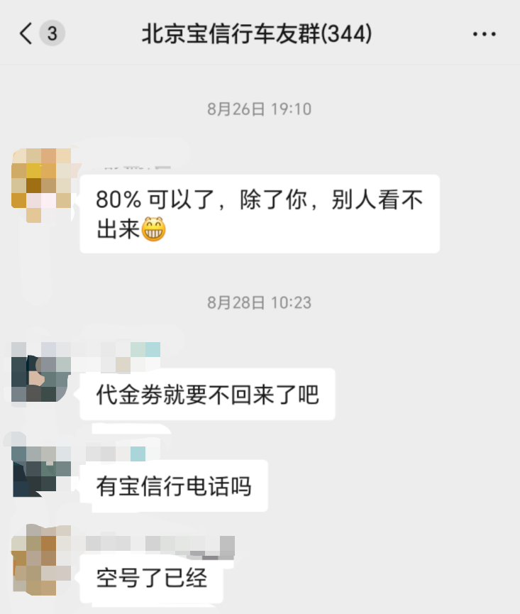 “趣解商业”了解到,不少车主都购买了宝信行的保养服务,其中大多是15888-20888元的双保无忧套餐,除此之外还有部分未兑现的数千元以及万元以上的代金券;这些车主组建了一个维权群,群内近250人是北京的,还有算上来自上海、杭州等地的车主一共344位,所有预付服务加起来,损失金额总计可能在500万元以上。