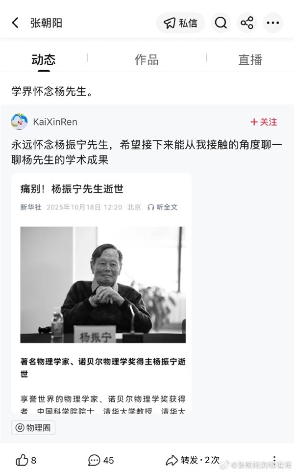 2025年10月18日,物理学界痛失巨擘,诺贝尔奖得主、中国科学院院士杨振宁在北京逝世,享年103岁。杨先生的离世引发学界与社会各界的广泛哀悼。清华大学、西湖大学及众多知名人士纷纷发文致敬,深切缅怀其卓越的学术成就与高尚人格。一位科技界人士回忆了曾聆听杨先生讲课的经历,称赞其即使年迈仍坚持站立授课,足见其对教育事业的热忱。杨振宁先生一生奉献于物理学研究与人才培养,其深远影响将激励后人不断探索科学真理。