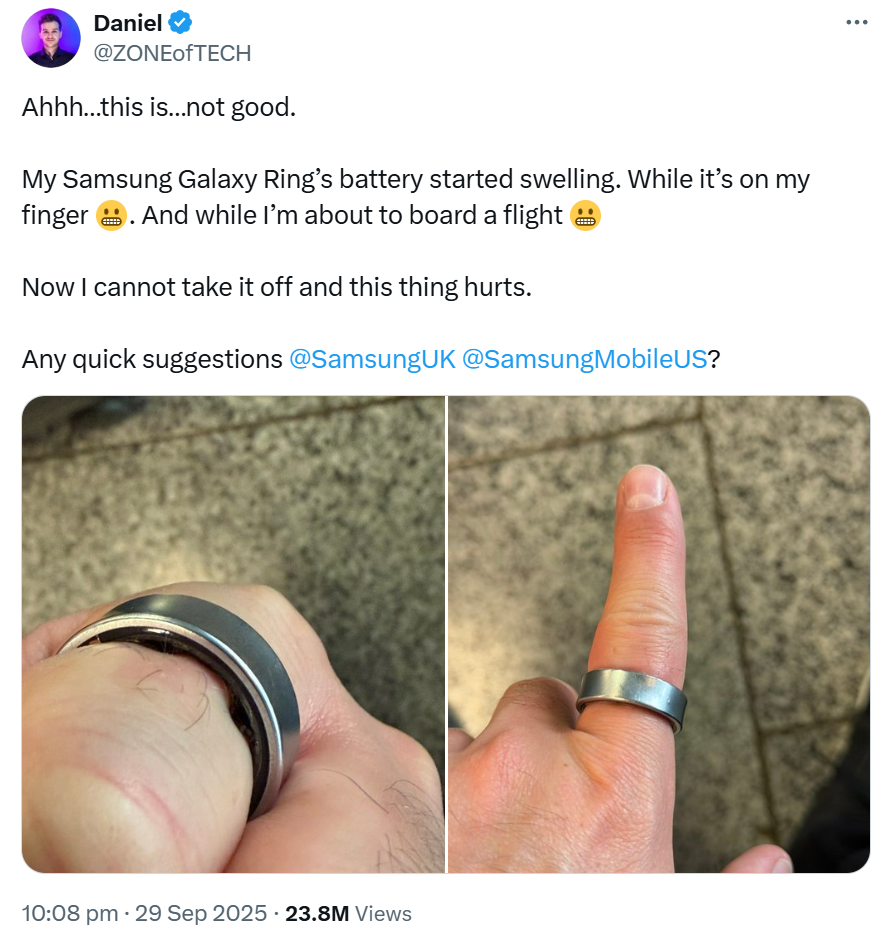 Daniel Rotar随即发布了一条推特,“我的三星Galaxy Ring电池开始膨胀。它正戴在我的手指上。”照片里,他的手指已经因为充血而肿胀发红。这条推特很快获得了2000多万的浏览量,不少人反映自己也在佩戴三星智能戒指时遭遇过类似的问题。