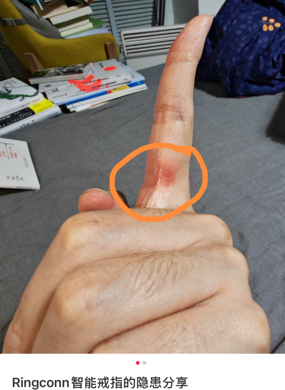 现实是,由于尺寸、重量、内部设计等问题,智能戒指也很难做到“无感”。有买了Ringconn智能戒指的用户反映,因为戒指内部传感器突出,一旦长时间跑步,使得戒指与手指摩擦加剧,手指充血又导致局部压强增大,使得他的手指已经被磨出红印。而体温变化、生病,也都会导致戒指变得“挤手指”。