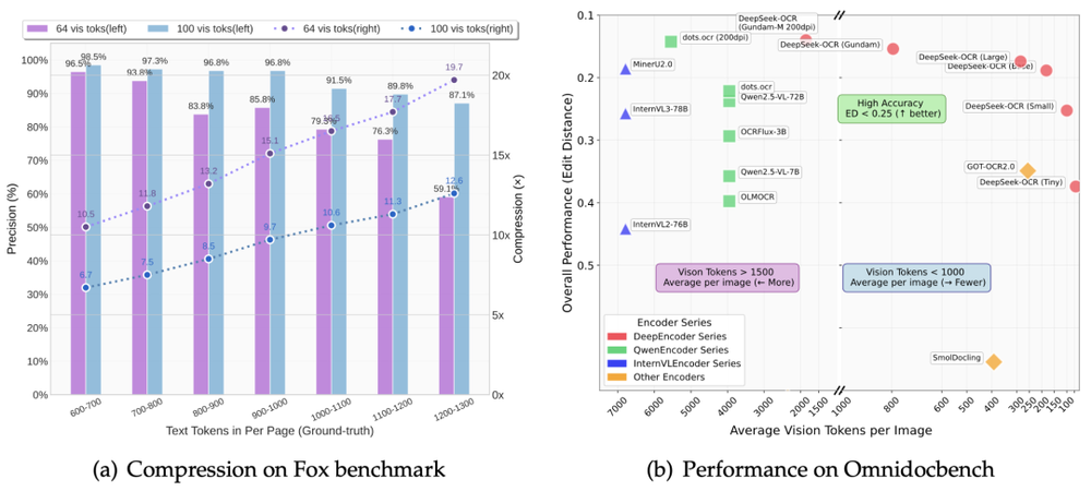 论文显示,DeepSeek-OCR的压缩率能达到10倍,OCR准确率还能保持在97%以上。