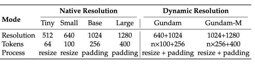 目前开源版本支持的模式包括原生分辨率的Tiny、Small、Base、Large四档,还有动态分辨率的Gundam模式,灵活性拉满。