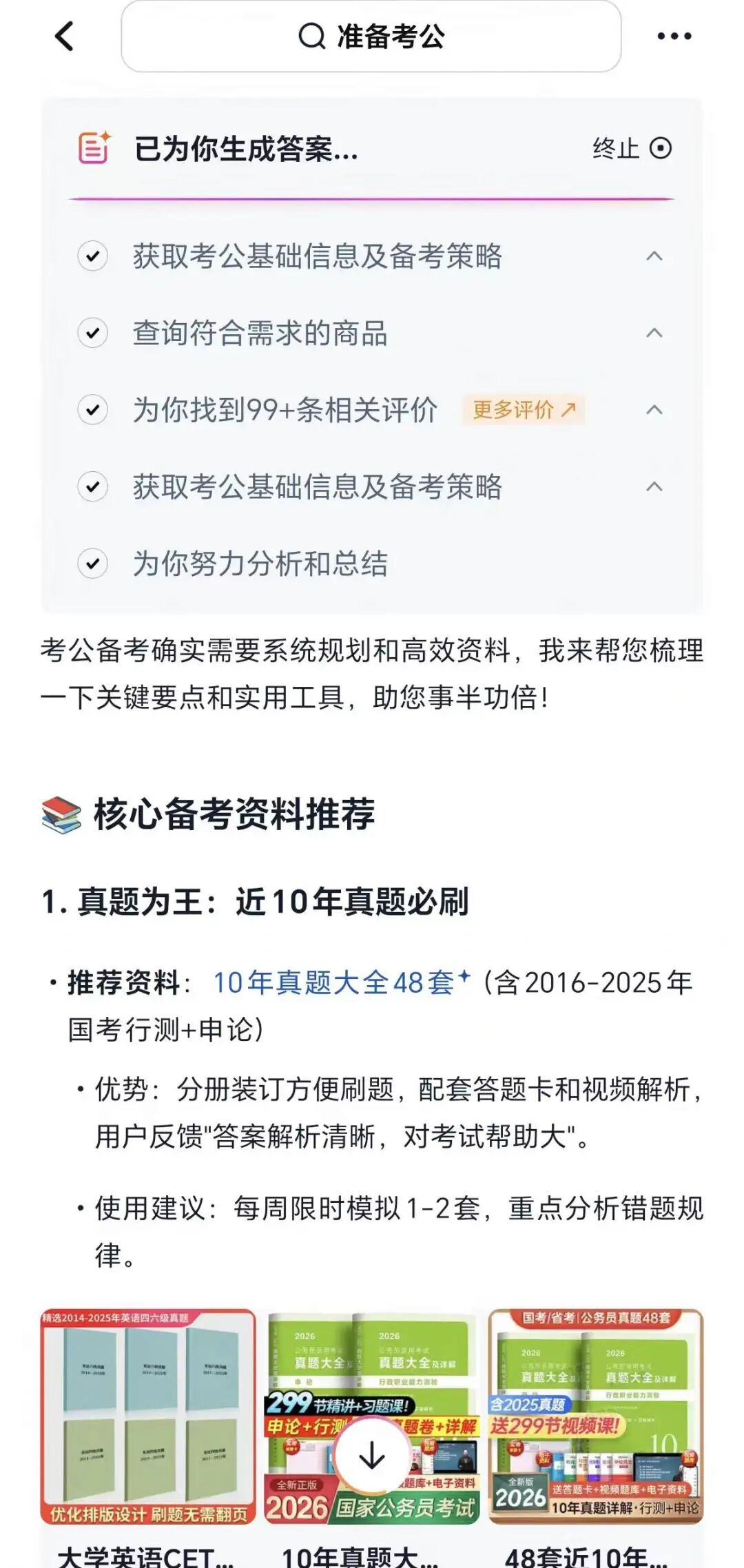 在消费者侧,AI 购物工具的使用频率明显提升。用户不需要搜索具体品牌,只需输入「想提高数学成绩」或「准备考公」,系统就能生成学习方案,并推荐对应的硬件和课程。教育产品因此进入自然推荐路径,不再依赖用户主动查找,而是通过 AI 识别需求后直接呈现。