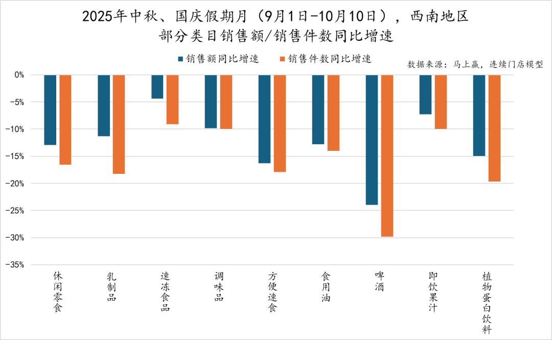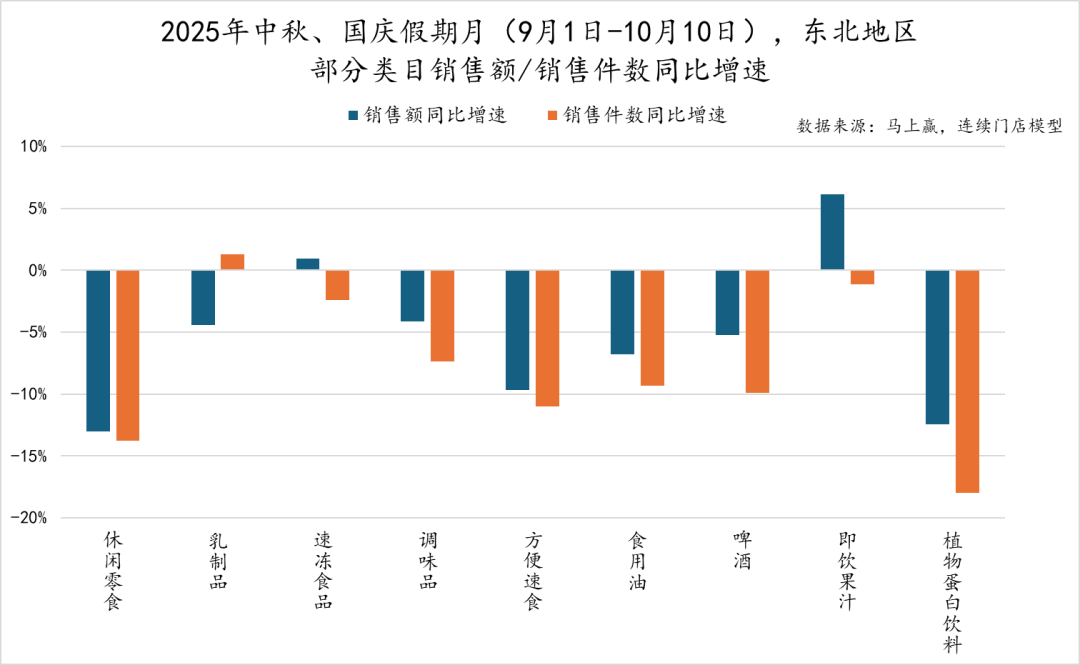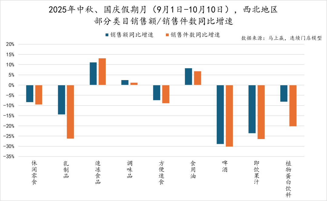 西北地区,啤酒、即饮果汁的销售额、销售件数同比均下降了超过20%,植物蛋白饮料、乳制品、休闲零食和方便速食也有不同程度的下降。而速冻食品、食用油和调味品的销售额和销售件数同比双双取得正增长,其中速冻食品的销售额和销售件数同比增长都超过10%。