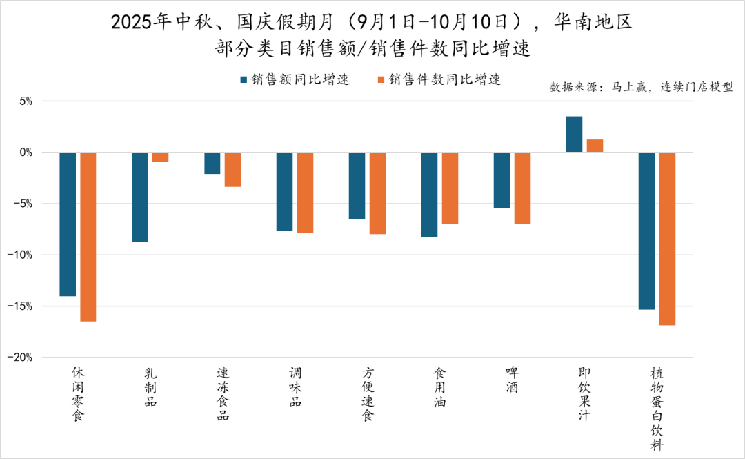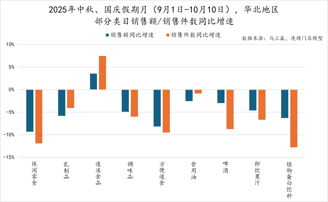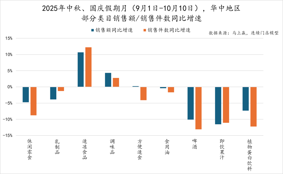 在华中地区,速冻食品的销售额与销售件数同比增长同样领先其他类目,调味品也保持销售额、销售件数同比正向增长。方便速食则是在销售额同比增长的情况下,件数同比下滑约5%。相比来说,华中地区下滑较为显著的是啤酒、即饮果汁、植物蛋白饮料类目,休闲零食也有着接近5%的销售额同比下滑和10%的销售件数同比下滑。