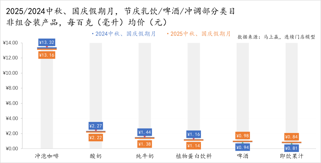 从上述类目在两个观察期内,非组合装产品的每百克均价来看,啤酒、即饮果汁两个类目呈现上涨,其他冲泡咖啡、酸奶、纯牛奶、植物蛋白饮料均呈现下跌。