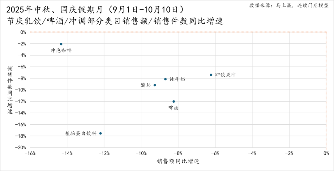 在该方向中,我们同样选择了礼赠、聚会属性较强的类目进行观察,包括纯牛奶、酸奶、啤酒、即饮果汁、啤酒、植物蛋白饮料及冲泡咖啡。