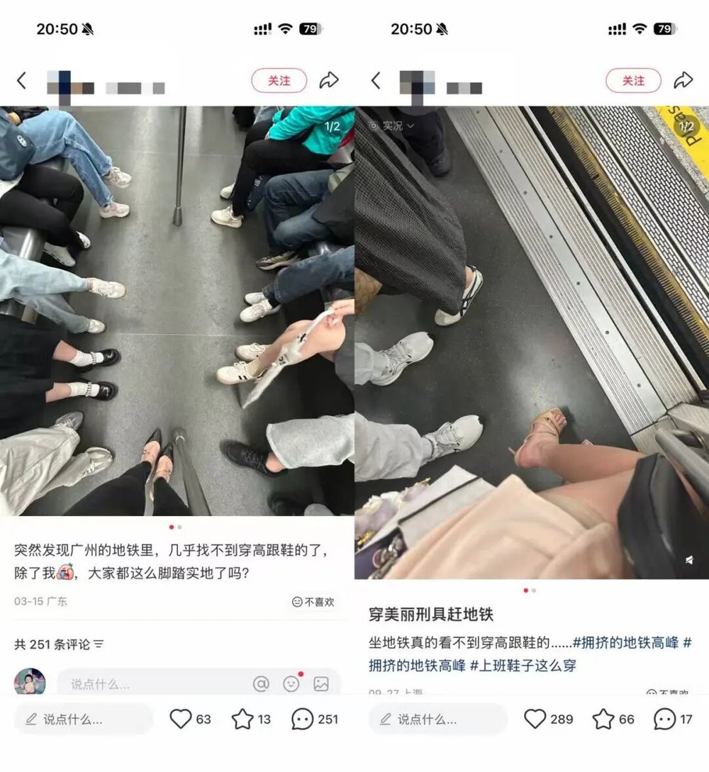 地铁里,几乎看不到高跟鞋了,上周有人偷拍了一张地铁里的高跟鞋,社交平台上最高赞的评论是:早高峰会不会踩伤人?