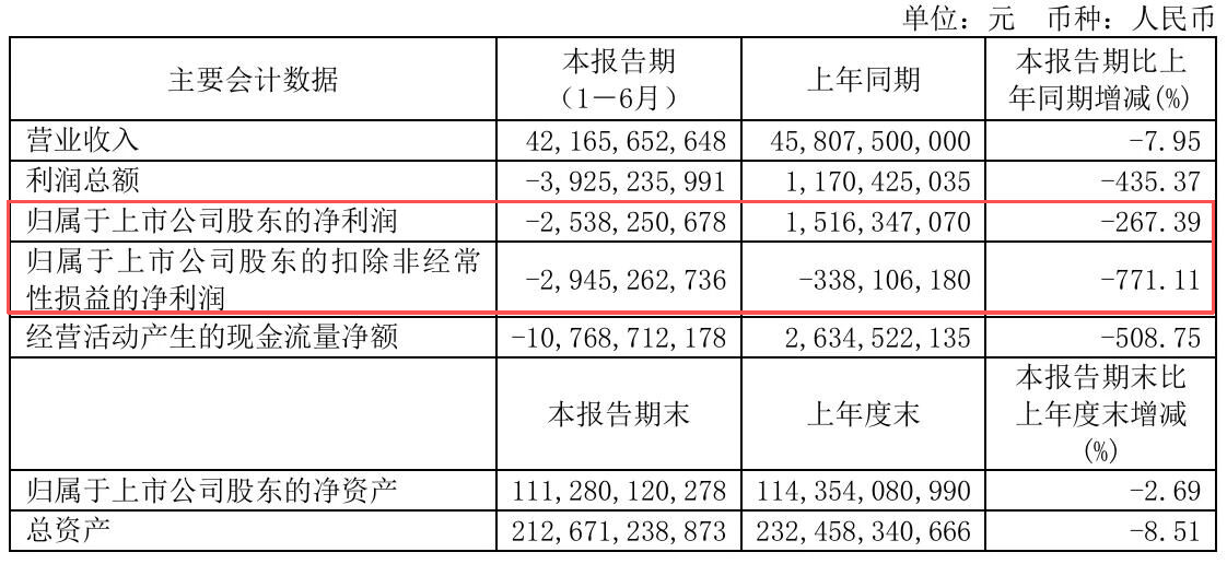 据2025年上半年财报显示,广汽集团合并口径的总收入为426.11亿元,同比下滑约7.88%;归母净利润、扣非后净利润分别由2024年上半年的15.16亿元、3.38亿元降至-25.38亿元、-29.45亿元,由盈转亏。
