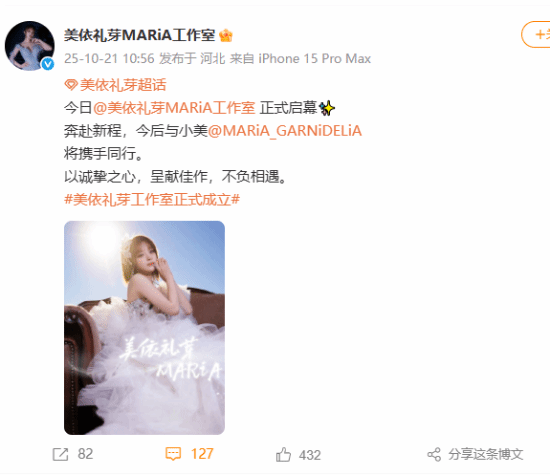 10月21日,日本歌手美依礼芽(MARiA)通过官方渠道宣布个人工作室正式成立,标志着她将在与原经纪公司解除合作关系后,以独立艺人身份开启职业生涯的新篇章。此前关于其发展动向的种种猜测也由此尘埃落定,粉丝纷纷回应:“我咩真的在内娱开启新阶段了?”