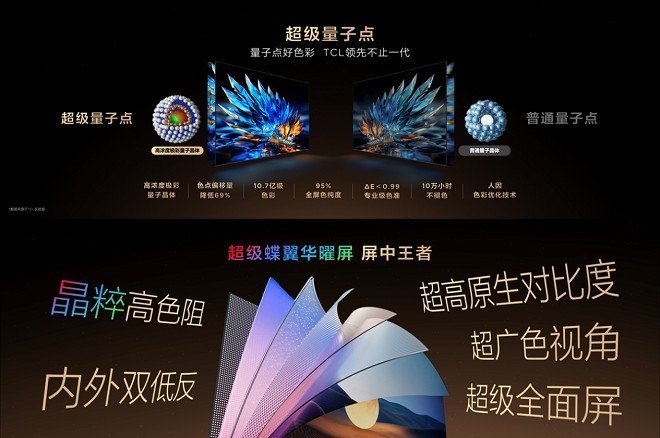 🌈 **“超级量子点+超级蝶翼华曜屏”是实现高色域的关键**:SQD-Mini LED技术的底层逻辑在于其创新的材料和结构。它利用超纯净蓝光激发超级量子点层中的高浓度量子点材料,混合成纯净白光,再通过超级蝶翼华曜屏的晶粹高色阻精准过滤杂色。这种“光谱收敛”的机制确保了超级量子的光谱与屏幕的穿透光谱完美适配,从而实现了满分的色域值,并保证了画面色彩的精准性和稳定性。