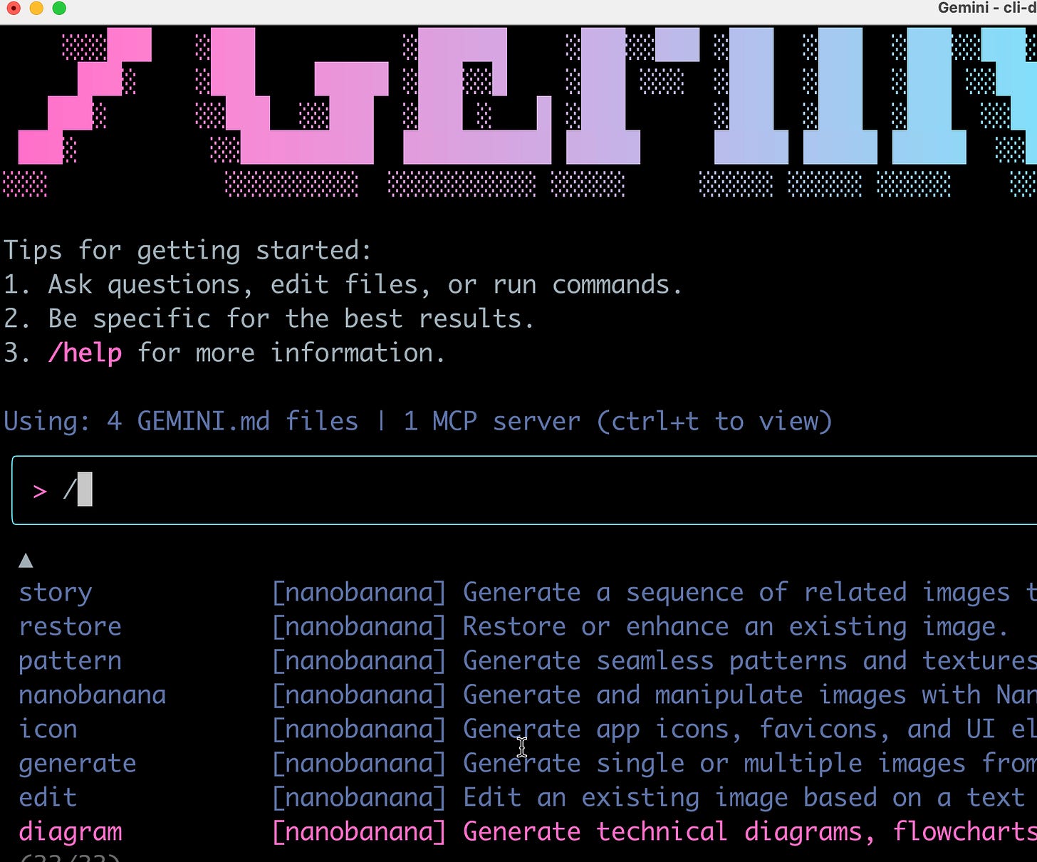 Extensions are a game-changer introduced in late 2025: they allow you to customize and expand Gemini CLI’s functionality in a modular way. An extension is essentially a bundle of configurations (and optionally code) that connects Gemini CLI to an external tool or service. One of my favorite examples was the Nano Banana extension, as highlighted by Richard Seroter: