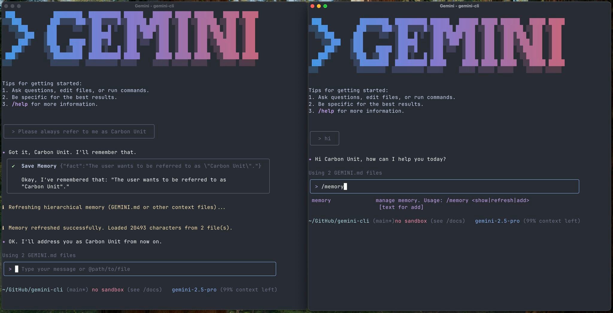 The /memory commands provide a simple but powerful mechanism for persistent memory. When you use /memory add <text>, the given text is appended to your project’s global context (technically, it’s saved into the global ~/.gemini/GEMINI.md file or the project’s GEMINI.md.