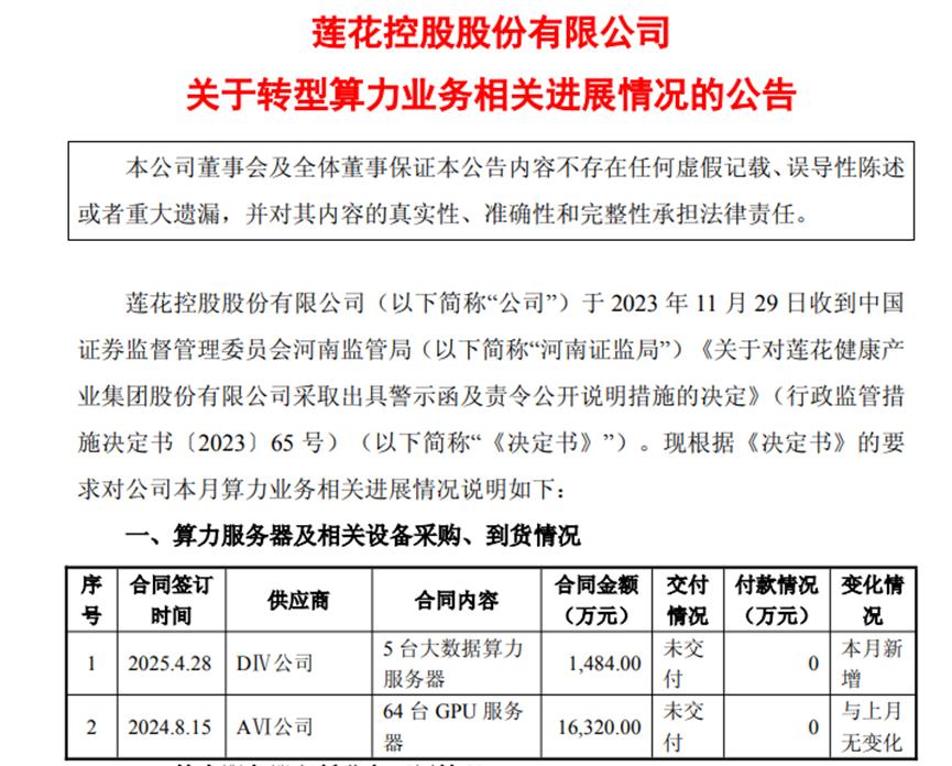 今年4月,莲花控股公告,莲花紫星2025年2月28日与 CⅨ公司签署《租赁合同》。基于宏观政策影响以及算力业务开展过程中出现的客观情况变化,莲花紫星于近日分别与上海X国企、CⅨ公司终止合作。