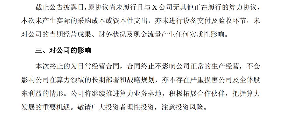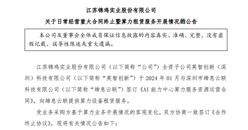 去年11月,锦鸡股份公告称,全资子公司于2024年1月与缔息云联签订《AI能力中心算力服务资源运营合同》,向其提供算力设备租赁服务。受业务采购方基于算力业务开展情况的客观变化,双方协商一致签订《合作终止协议》。