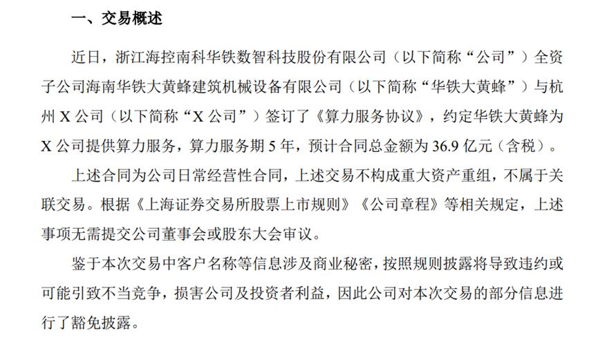 今年3月,海南华铁公告,全资子公司华铁大黄蜂与杭州X公司签订《算力服务协议》,为其提供算力服务,服务期 5 年,预计合同总金额为36.9亿元。