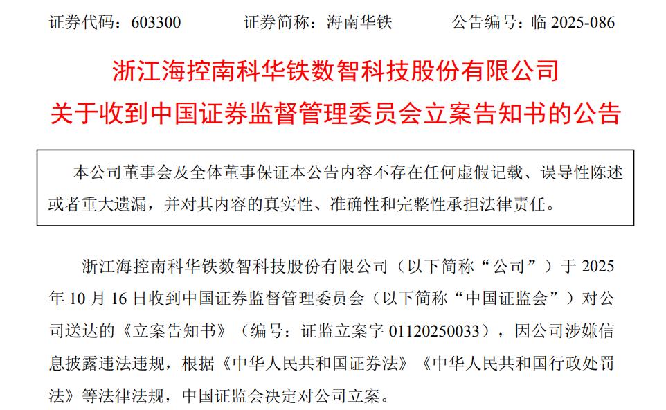 10月16日,证监会正式对海南华铁立案,原因是公司涉嫌信息披露违法违规,违反《中华人民共和国证券法》《中华人民共和国行政处罚法》等法律法规。