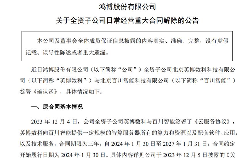 今年3月,鸿博股份公告称,此前全资子公司与百川智能签署《云服务协议》,向对方提供一定规模的智算服务器所有的算力和资源以及配套。受不可抗力因素影响,原合同已无法继续履行,经双方协商一致,停止原合同相关合作。
