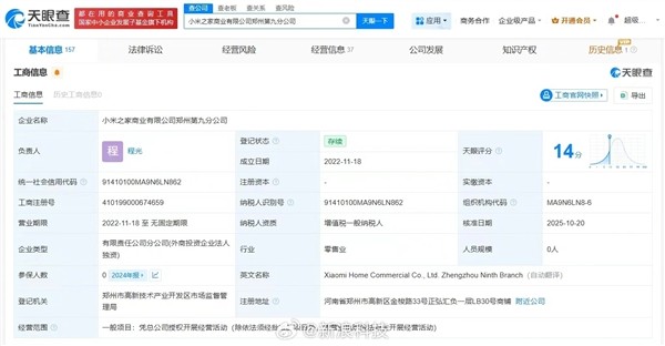 工商信息显示,小米之家商业有限公司郑州第九分公司近日发生人事变更,王腾已不再担任该公司负责人,接任者为程光。目前,王腾仍关联一家小米科技有限责任公司郑州分公司,担任相关职务。