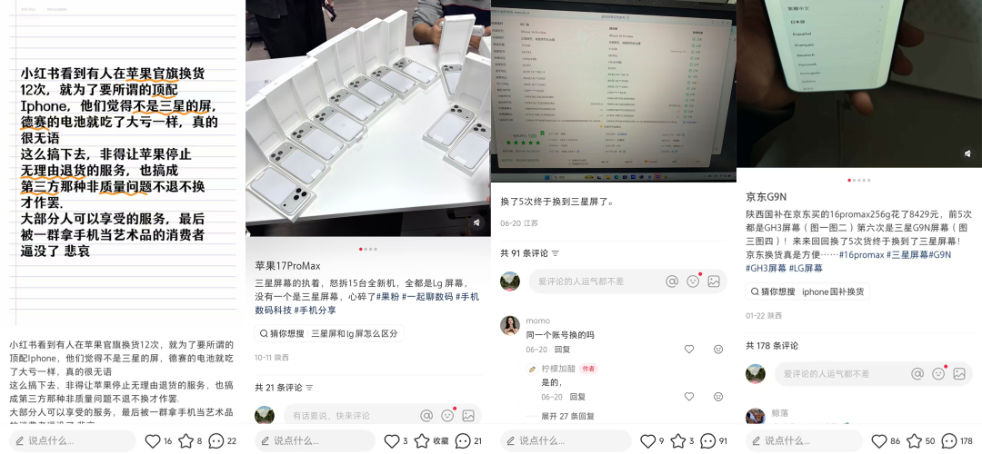这里说的抽奖,不是那些博主“我们给大家抽一款全新 iPhone!”的抽奖,而是在小红书、贴吧等平台上,有这么一群 iPhone 用户,他们利用苹果的 14 天无理由退换货政策,不断退货、换货,誓要“抽”到一台显示没有色差、没有色偏、字体通透,且必须屏幕产自三星的 iPhone。