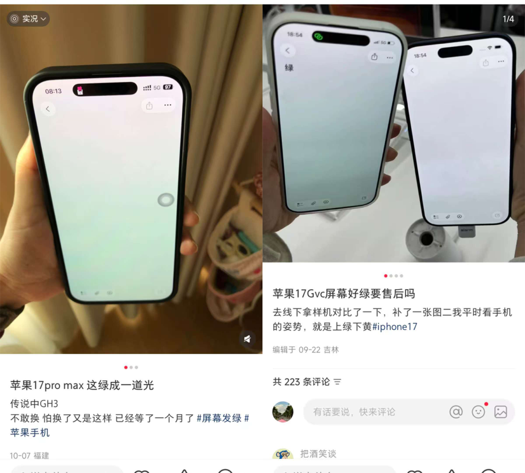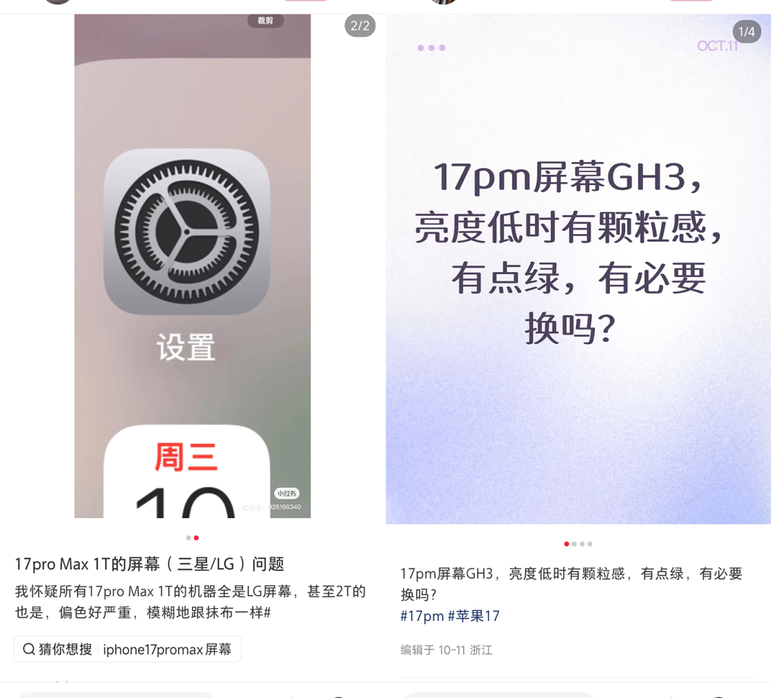 以今年 iPhone 17 Pro Max所用的 LG GVC 面板为例,在同一个批次中,就有用户拿到了观感通透、色彩纯正的“完美屏”,甚至说这才是 iPhone 17 Pro Max 这代的“天花板”,同时也有用户报告了虽然抽到了三星屏,但出现了轻微的黄绿偏色或“抹布感”。