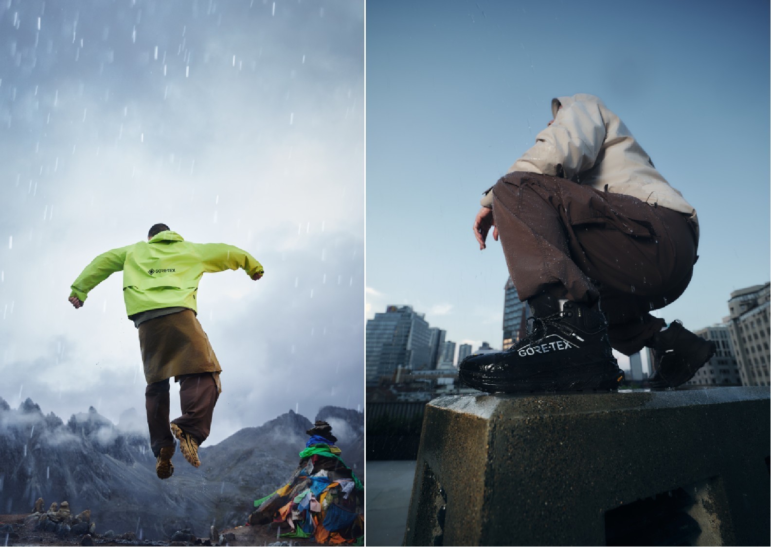 🌧️ 广告片通过山野和城市户外场景,展现GORE-TEX产品持久防水、防风、透气的卓越性能,适用于徒步、登山、通勤等多种环境。